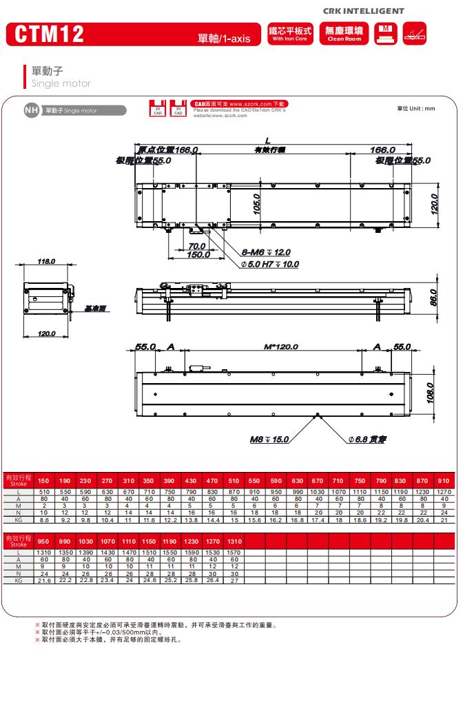 直線電機擁有密閉式的外裝,可防止異物侵入本體內部,增加抽氣嘴的裝置可將機臺內運轉產生的微小顆粒抽離,并通過測試可對應無環境使用。重復精度可達 ±0.005mm,最高運行速度可達 3000mm/s,本體最小寬度120mm。在高科技半導體,面板,新能源生產設備有著極高的信賴度,并有效的減少品的污染及破壞,廣泛應用于高科技半導體、面板、新能源等領域。