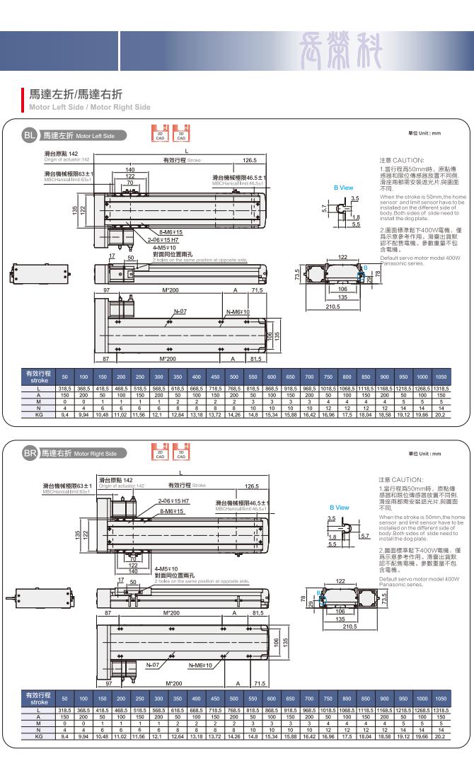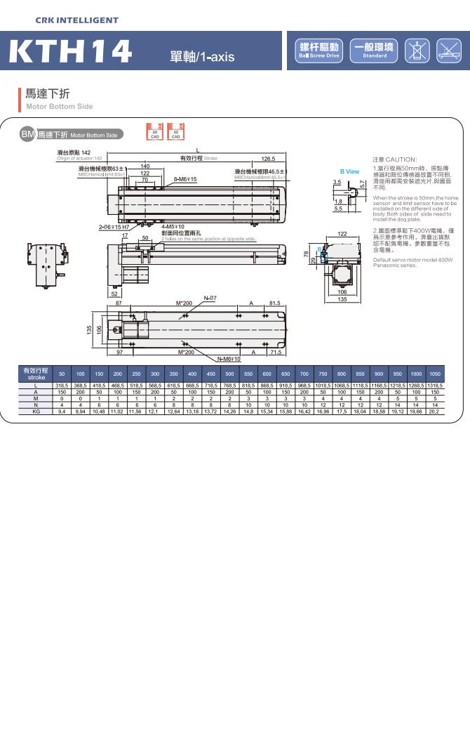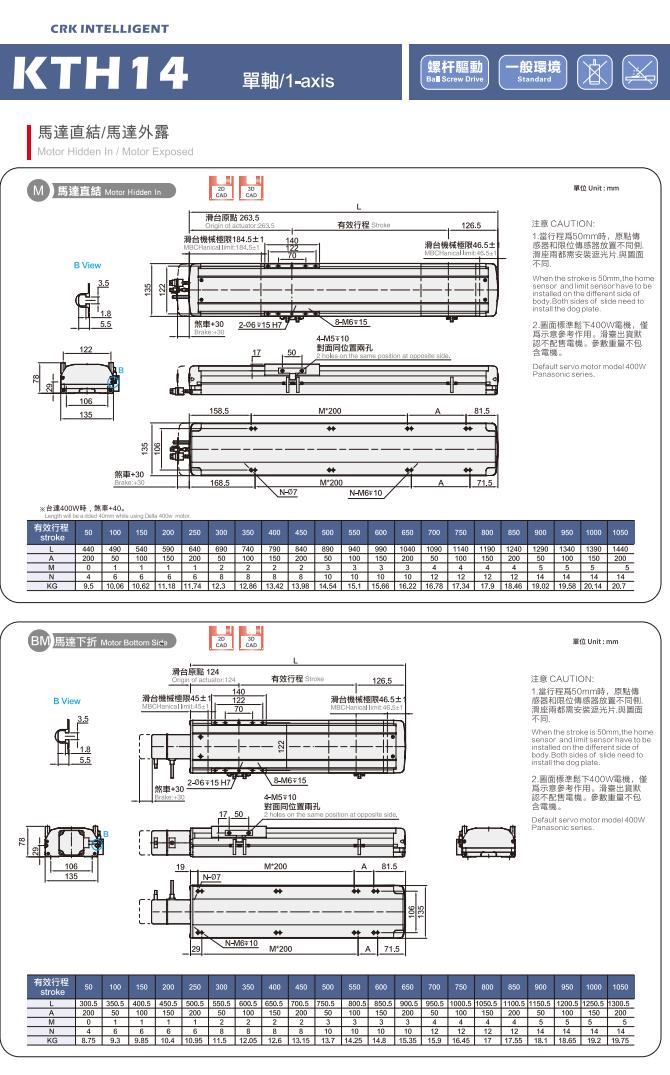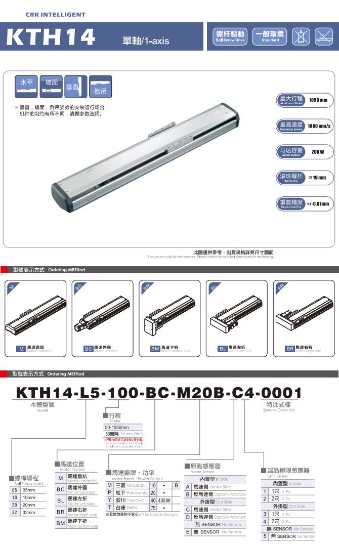 KTH14 半密封螺桿模組是一款高性能的單軸驅動設備。它適用于水平、墻面、垂直以及倒吊等多種安裝姿勢,但不同安裝姿勢下機種的使用會有一定制約。該模組具有多種電機位置選擇,包括直連、馬達下折、馬達左折、馬達右折等。